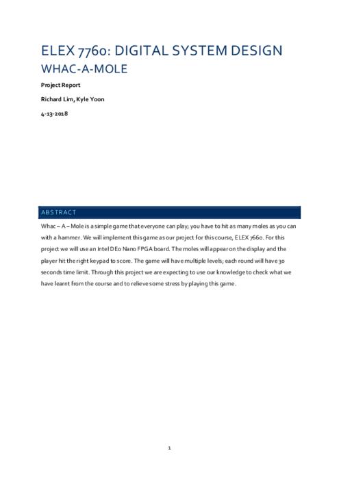 Whac-A-Mole is a simple game that everyone can play; you have to hit as many moles as you can with a hammer. We will implement this game as our project for this course, ELEX 7660. For this project we will use an Intel DE0 Nano FPGA board. The moles will appear on the display and the player hit the right keypad to score. The game will have multiple levels; each round will have 30 seconds time limit. Through this project we are expecting to use our knowledge to check what we have learnt from the course and to relieve some stress by playing this game.